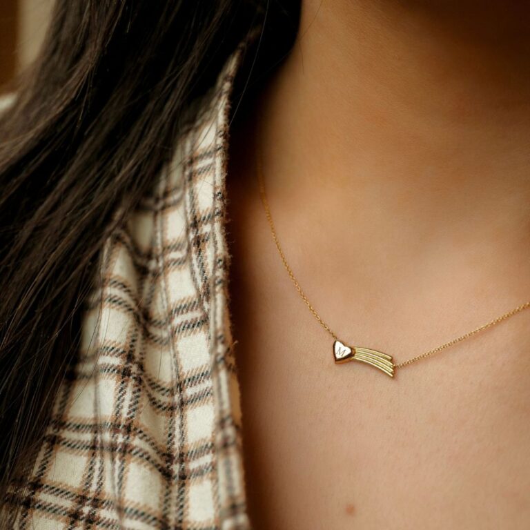 With the Minitials Shooting Heart Necklace you can create your own falling heart. They say when a heart falls from the sky, it chooses where it lands. This 18-karat solid gold falling heart belongs to the moments, the people and the love that shaped you.